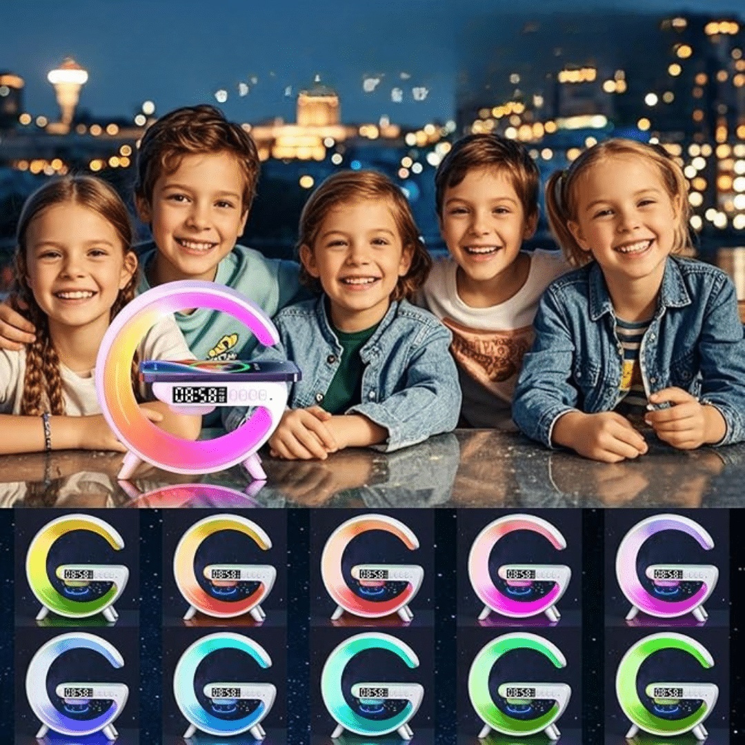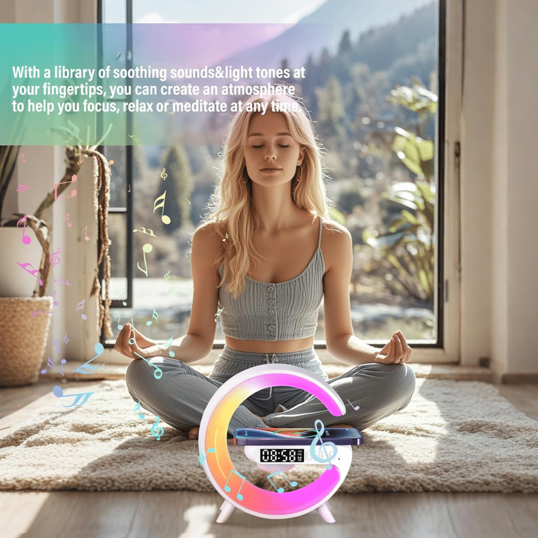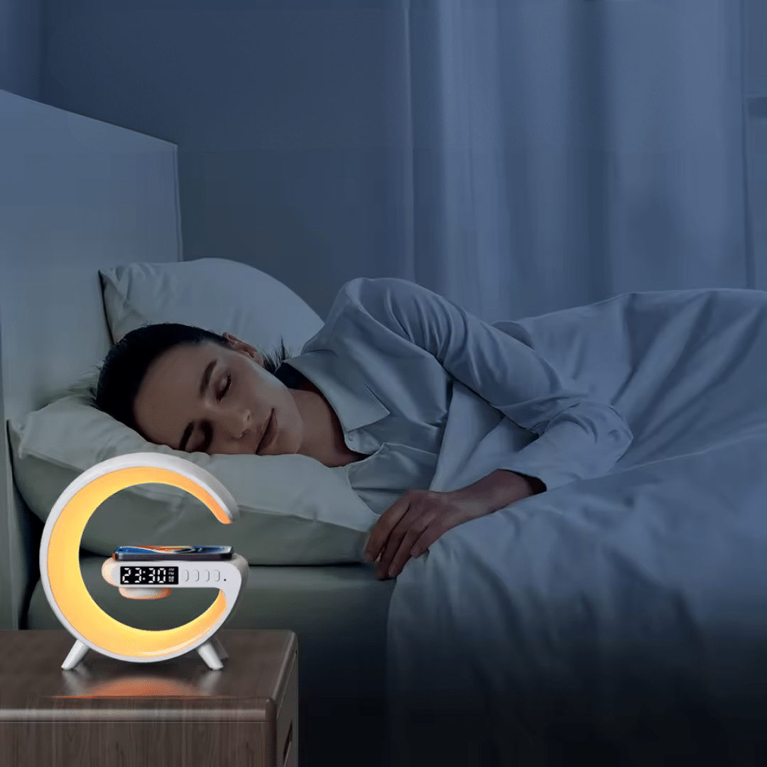 WaveLoop Speaker is your all‑in‑one nightstand upgrade: a stylish 5‑in‑1 device that combines a hi‑fi Bluetooth speaker, sunrise alarm, RGB mood light, wireless charging pad, and digital clock.